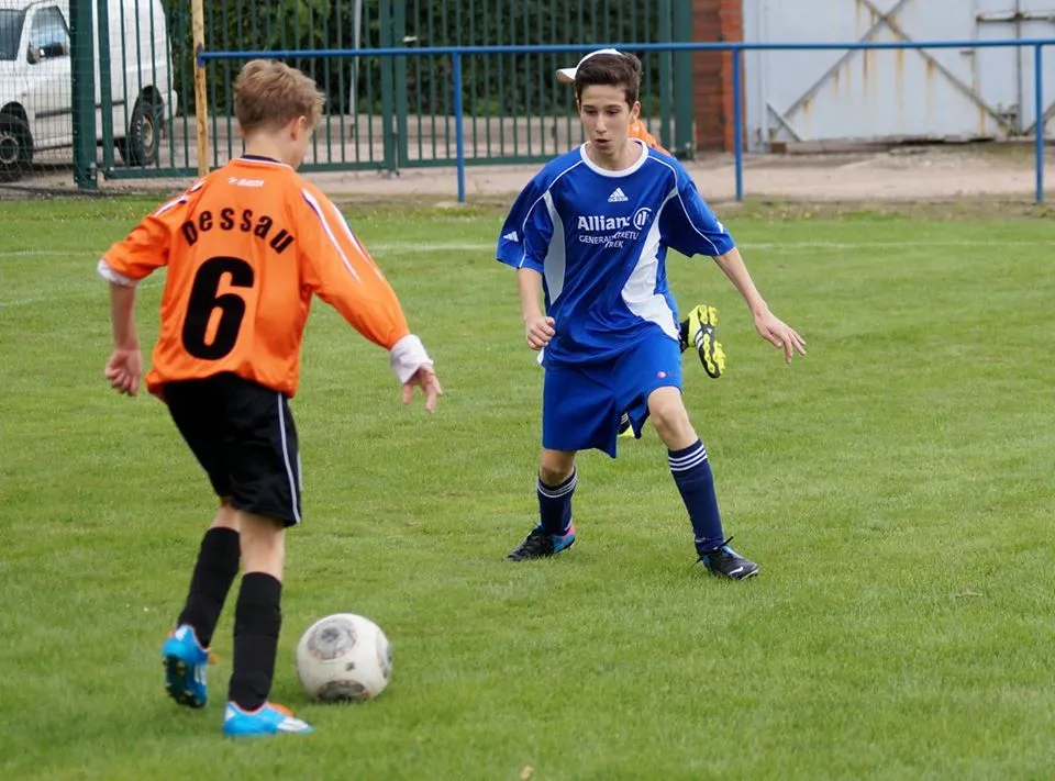 Das erste Spiel unserer neu formierten C Junioren ging am Samstag mit 1 : 6 verloren. Dem Spiel fieberten das neue Trainerteam Meye/Pelzel sowie Spieler und Eltern erwartungsvoll entgegen. Die zweiwöchige Vorbereitung wurde von allen Spielern gut angenommen und dementsprechend gespannt ging es in diese Partie. Mit Dessau 05 II stand uns der erwartet schwere Auftaktgegner gegenüber. Viele Spiel hatten bereits ein Jahr Großfelderfahrung hinter sich, was in unserem Team bei nicht einem Spieler der Fall war. Von Anfang an waren die Gäste spielbestimmend. Körperlich robust und technisch beschlagen, konnten die Gäste sofort viel Druck auf unsere Abwehrreihen ausüben. Doch unser Team konnte,vor allem in der ersten Hälfte, gerade in der Abwehr, viele Aktionen der Schillerparkkicker vereiteln. Ein kleiner Abwehrfehler in der 9. Minute nutzten die Gäste allerdings sofort aus und ließen unserem Torwart K. Schlosser keine Abwehrchance. Danach war unser Team sehr bemüht auch offensiev Akzente zu setzten, doch das viel unseren Jungs noch sichtbar schwer. Lediglich ein sehr guter Flachschuss von Stürmer N. Kaczinski, der nur knapp am 05 Tor vorbei ging, konnten die Trainer verzeichnen. Zu viele unklare Pässe beim Spielaufbau und stellenweise technische Fehler bei der Ballannahme nutzten die Gäste immer wieder zu Kontern und guten Chancen, die unsere Abwehr bzw. unser Torwart jedoch vereiteln konnten. Bis zur 30. Minute schaffte es 05 nicht sich entscheiden durchzusetzen. Doch dann der erste richtig gut vorgetragene Angriff der Gäste, welcher dann auch das 2 : 0 einbrachte. Halbzeit. In der Halbzeit wurden die Fehler durch die Trainer klar angesprochen, aber auch die bis dahin gute Abwehrleistung gewürdigt. In der zweiten Hälfte dann das gleich Bild. Die Gäste bis zum Strafraum gut, aber unser Team versuchte stets die Angriffe zu unterbinden. Allerdings übten die nun stärker werdenden Gäste noch mehr Druck aus und lebten größtenteils, zwar von kleinen Fehlern unseres Teams, doch diese wurden dann clever bis zur 0 : 5 Führung in der 61. Minute ausgenutzt. Dann endlich in der 65. Minute einmal eine richtig gute Ballstafette unserer Jungs die 05 nur mit einem Faul im Strafraum unterbinden konnte. Elfmeter und das erste Tor für unser Team. Den Schlusspunkt setzten dann allerdings nicht die 05'er, sondern unsere Jungs mit einem unglücklichen Eigentor zum 1 : 6 . Fazit: Am Ende steht zwar eine klare Niederlage, doch lediglich ein heraus gespieltes Tor der Gäste war zu verzeichnen. Alle anderen Tore waren Ergebnisse von Fehlern unseres Teams auf Grund der noch, verständlicherweise, fehlenden Erfahrung und Cleverness im Abwehr und Angriffsverhalten. Hieran gilt es zu Arbeiten. Kämpferisch hat sich unser Team nichts vorzuwerfen.