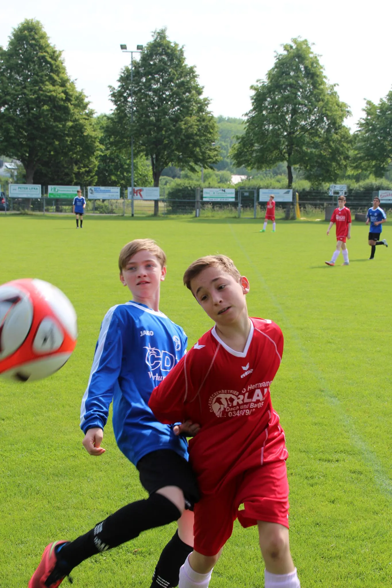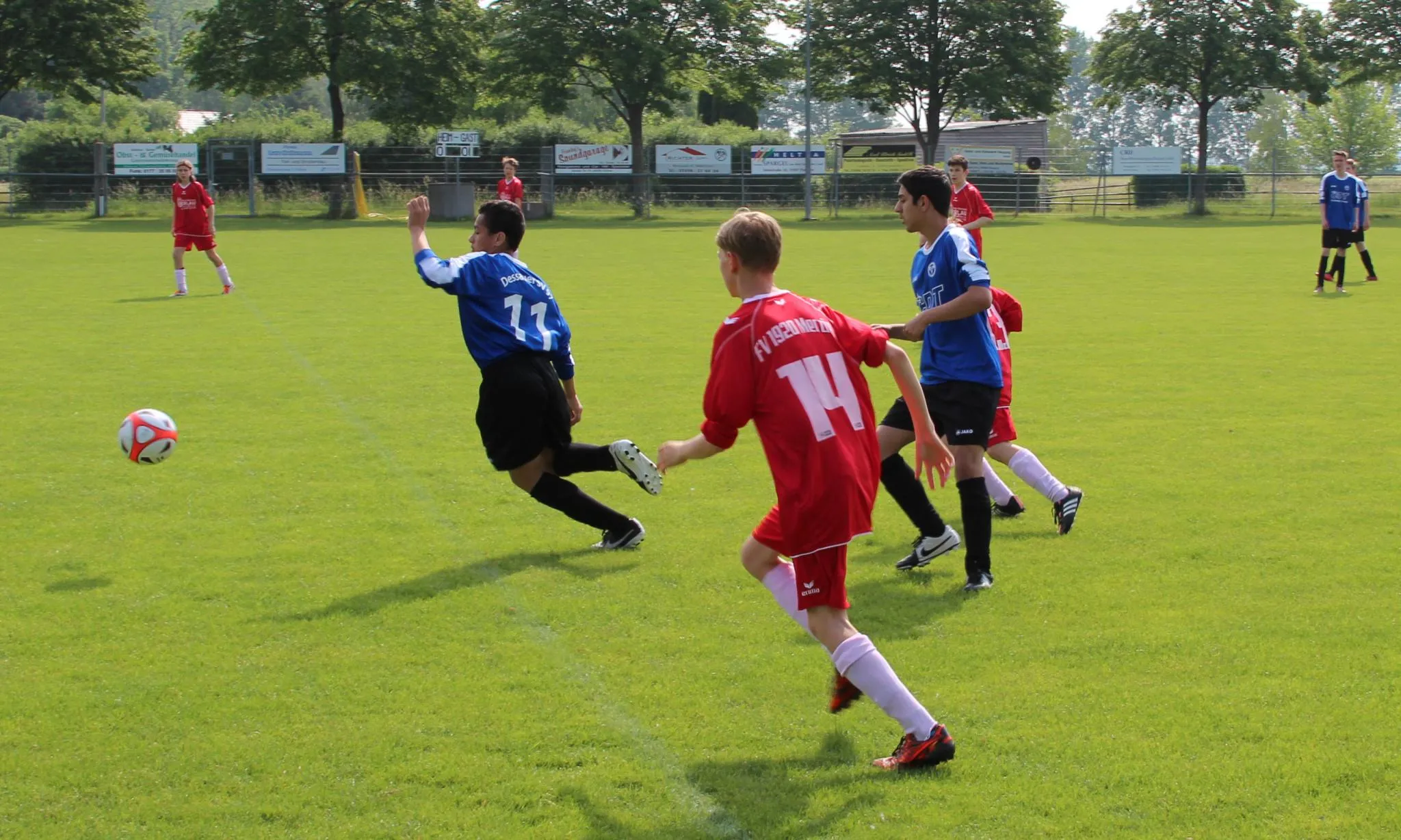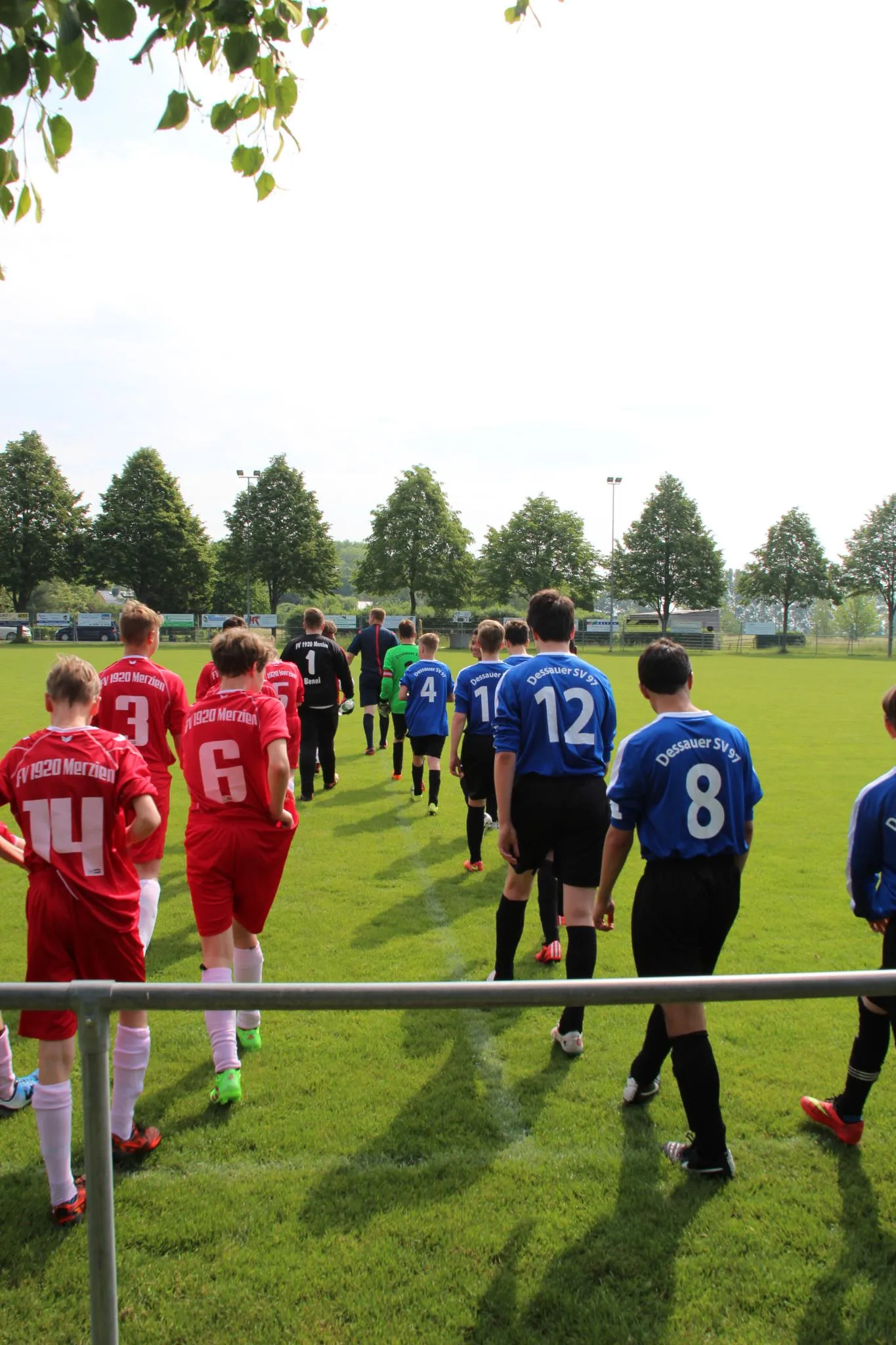 Fotos: V.Kaczinski - Im letzten Spiel der Saison trafen unsere C-Junioren auf den Tabellenachten FV 1920 Merzien. Nicht nur vom Tabellenstand her sollte es eine klare Sache für unsere Kicker werden, sondern auch über die gesamte Begegnung dominierte der DSV das Spiel. Schon in der ersten Minute hatten unsere Stürmer D. Benckenstein und N. Kaczinski eine Doppelchance, doch beide scheiterten noch am Pfosten. Bei schwül warmen Temperaturen und dem am Vortag von den meisten Spielern gesehenen Champions Liga Finale, war einigen Spielern die Müdigkeit ins Gesicht geschrieben. Beide Trainer wirkten jedoch sofort entgegen und brachten die Jungs auf Trab. Die zeigten in der Folge gefälligen und stellenweise ansehnlichen Fußball und standen vor allem in der Abwehr sehr sicher. Großen Anteil daran hatte R. Zabel, der die Innenverteidiger Position einnehmen durfte. In der 17. Minute dann ein sehr schöner Spielzug über die rechte Seite. M. Lübeck mit einem schönen Pass auf D. Benckenstein, der sicher zur verdienten Führung Einnetzen konnte. DSV nun weiter am Drücker, doch vor dem Tor war man ein wenig überhastet und konnte selbst Beste Chancen nicht nutzen. Halbzeit.
