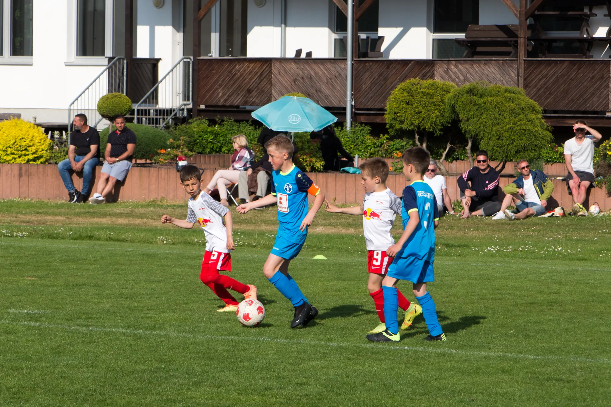 Fazit: Ein tolles Erlebnis und ein tolles Spiel zweier super Teams ging mit einem sicherlich knapp verdienten Sieg für unsere Farben zu Ende. Hier agierten zwei Teams auf Augenhöhe, die sich einen Schlagabtausch vom feinsten lieferten. Sicherlich haben wir nicht die individuelle Klasse wie zB Nr 7 von RB, der am Ball und auf engstem Raum alles konnte, aber wir waren super giftig in den Zweikämpfen, stets griffig und dazu enorm offensivstark. Man will gar kein Kind in dem Sinne herausheben, da alle überzeugten vom Vielspieler Hannes, der bis auf 8 Minuten durchspielte, bis hin zu Emil und Nico, die vielleicht nur 7 Minuten spielten, aber sich in jeden Ball warfen und bis zur Erschöpfung rannten. Wie Nico, als jüngster Spieler auf dem Platz sich gegen 3 RB Verteidiger durchgesetzt hat, wird ihn auf seinem weiteren Weg hoffentlich weiter motivieren. Dazu überzeugten auch viele unserer Kids beim 3vs3 Funino, wo wir nicht chancenlos waren und auch viele gute Aktionen einstreuten. Man kann nur stolz sein. Diesen Tag wird man sicherlich noch lange in bester Erinnerung behalten. Vielen Dank an RB für das sehr freundliche Empfangen und Bewirten, es wird sicherlich nicht unser letzter Besuch dort gewesen!