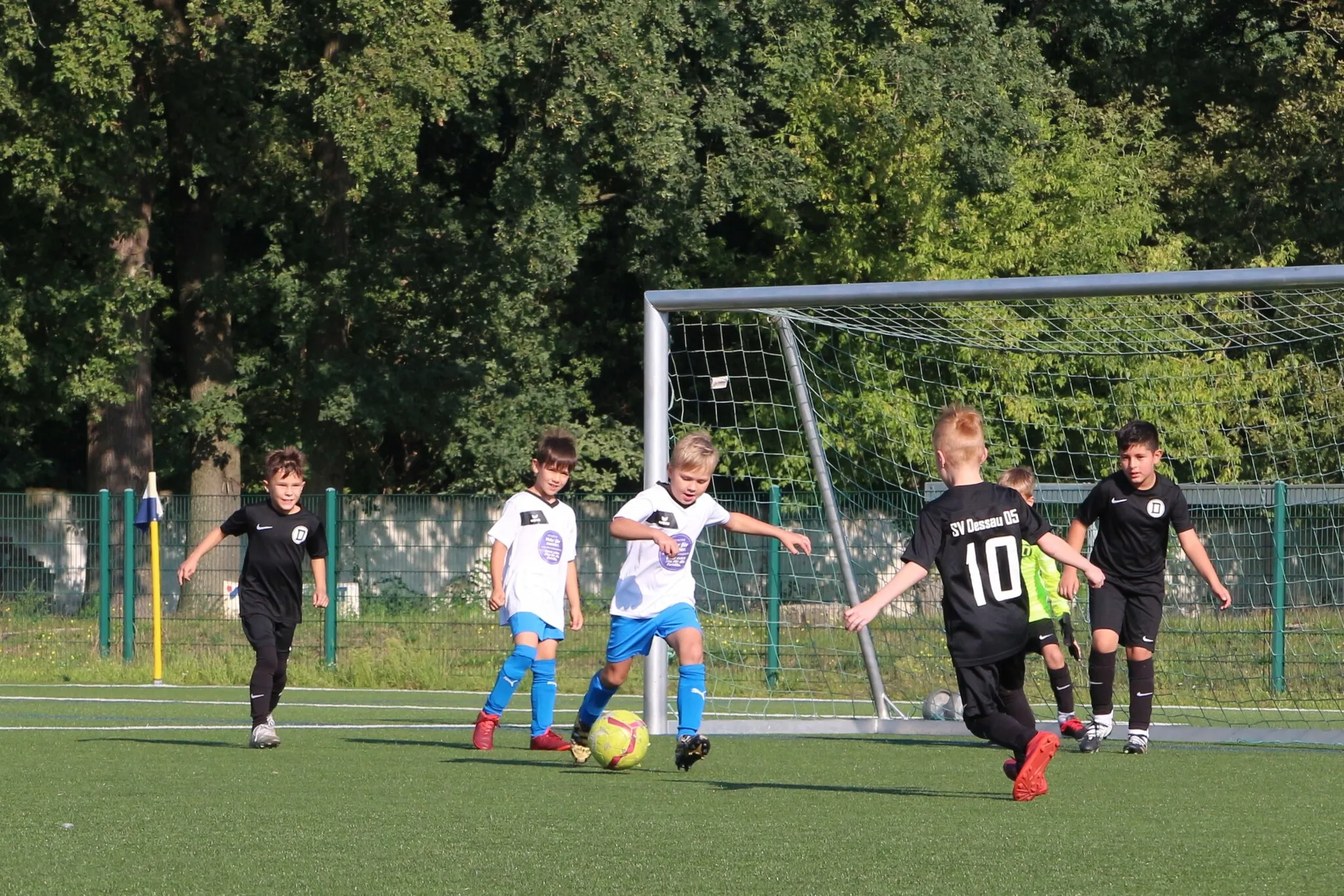 Zum Saisonstart erwartete unsere neue F1 die F1 von Dessau 05. Erste Saisonspiele sind stets schwierig und so wollte man voll fokussiert in diese Aufgabe gehen. Gesagt getan, zu Beginn wirbelte unsere offensive 4er Reihe um Hannes, Dario, Lennox und Liam den Gegner schwindelig. Beinahe minütlich schossen wir ein Tor und ließen 05 auch kaum raus aus der Hälfte. Durchaus schöne Spielzüge zeigten unsere Jungs zu dem Zeitpunkt und man war draußen zufrieden. Allerdings schlich sich nach 15 Minuten und den ersten Wechseln ein Bruch ein. Aus dem Nichts schenken wir 05 quasi dem Ball vor dem Tor 2 Mal und die nutzen es zu 2 Toren, während wir nur noch einmal trafen. In der Halbzeit schwor man sich auf eine konzentrierte 2. Hälfte ein, aber leider war die Ordnung nun weg und wir gingen auch nicht mehr konsequenz in die Zweikämpfe, so dass 05 das Spiel jetzt offen gestaltete. Egal wen man wieder einwechselte, die Spielfreude vom Beginn fand man nicht mehr. 05 traf so auch verdient einmal, während wir nur durch 2 Einzelaktionen von Hannes noch zum Torerfolg kamen. Nach 40 Minuten war das sehr faire Spiel dann auch pünktlich vorbei.