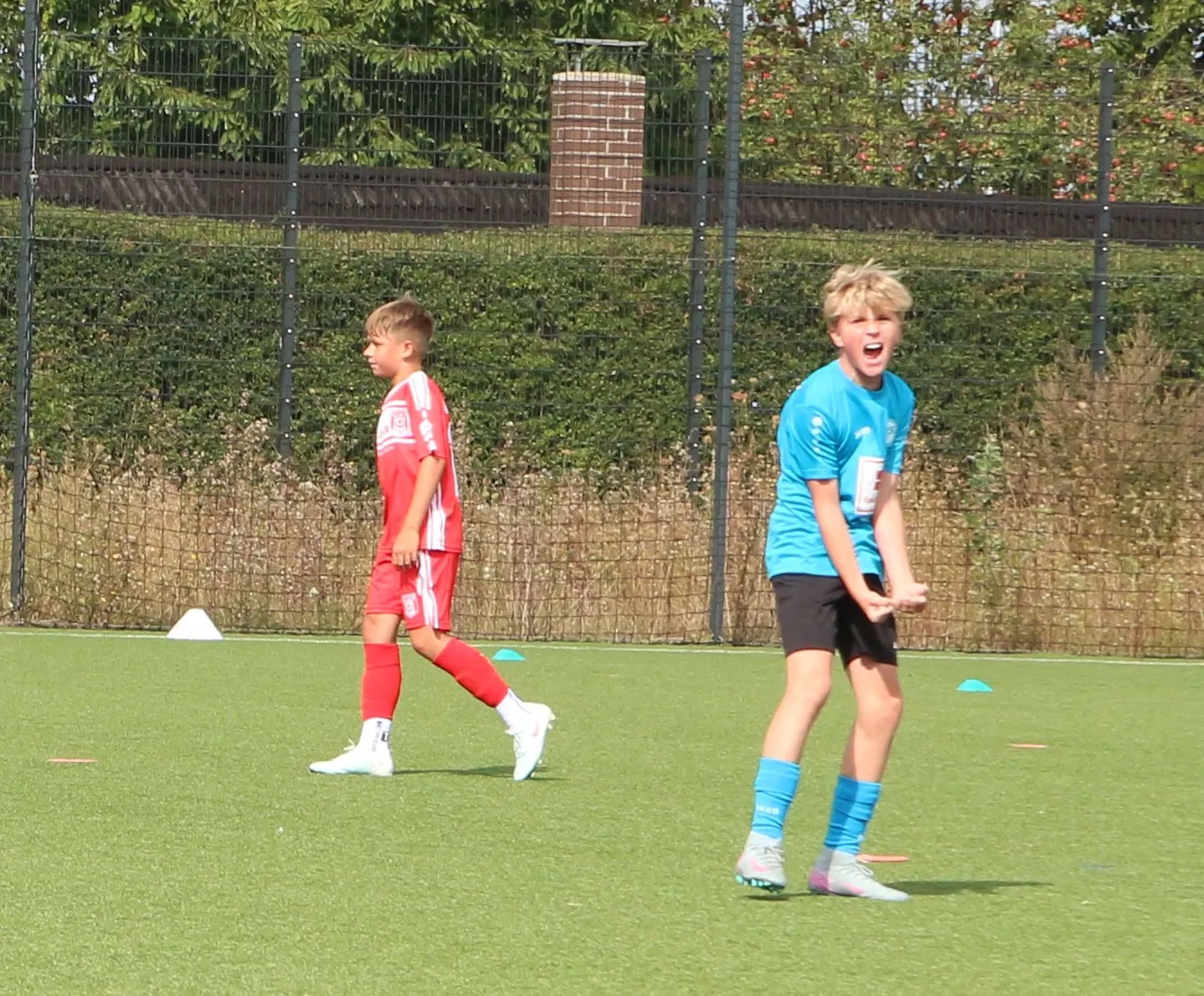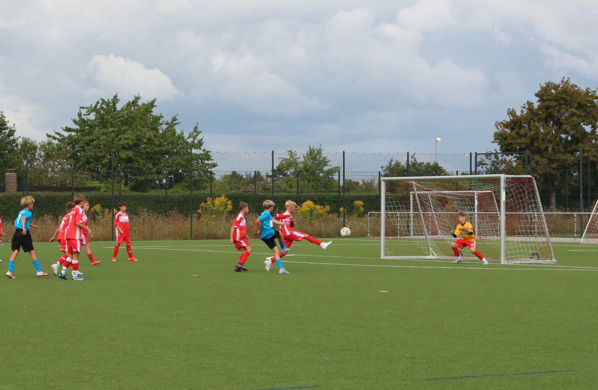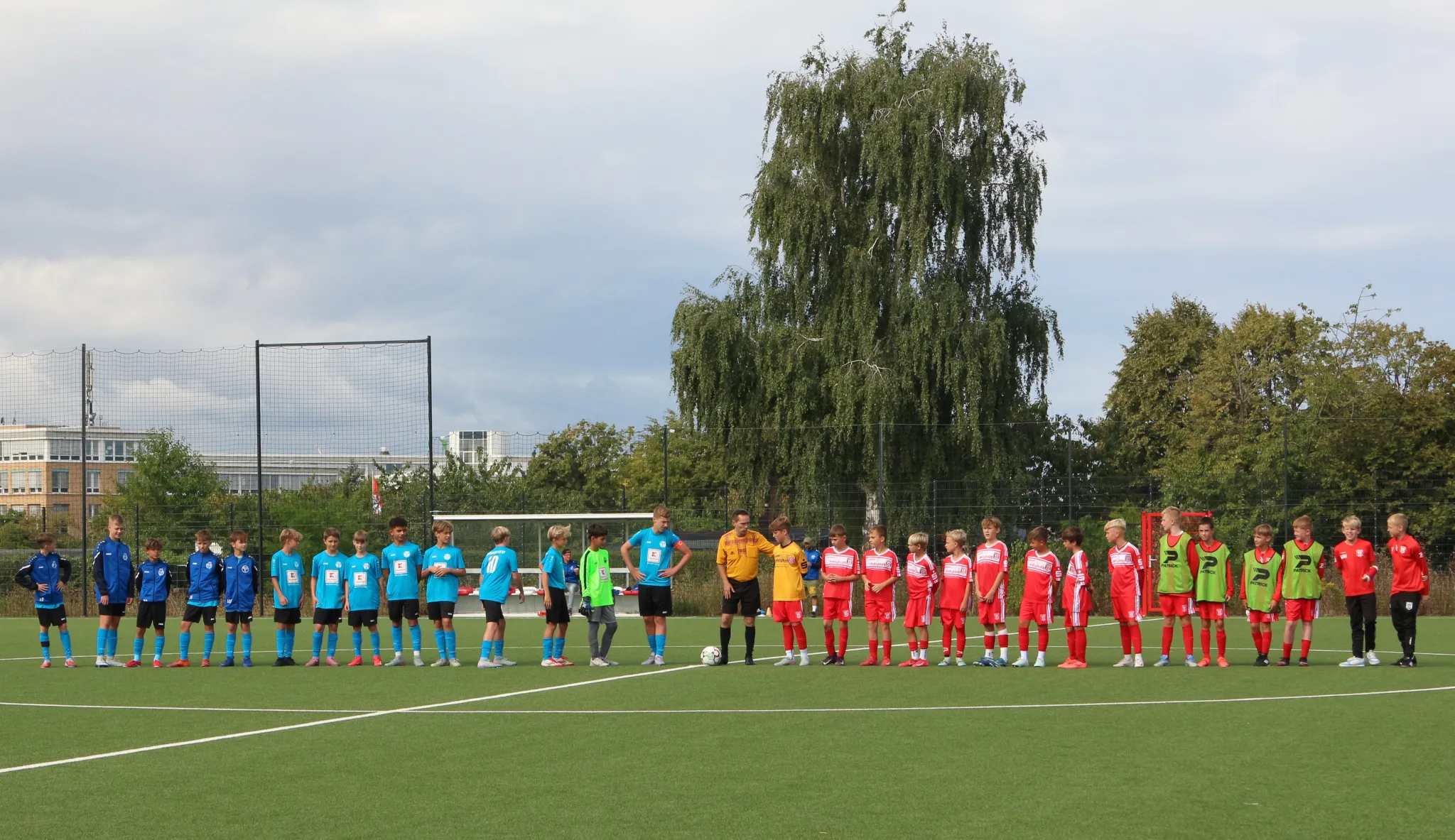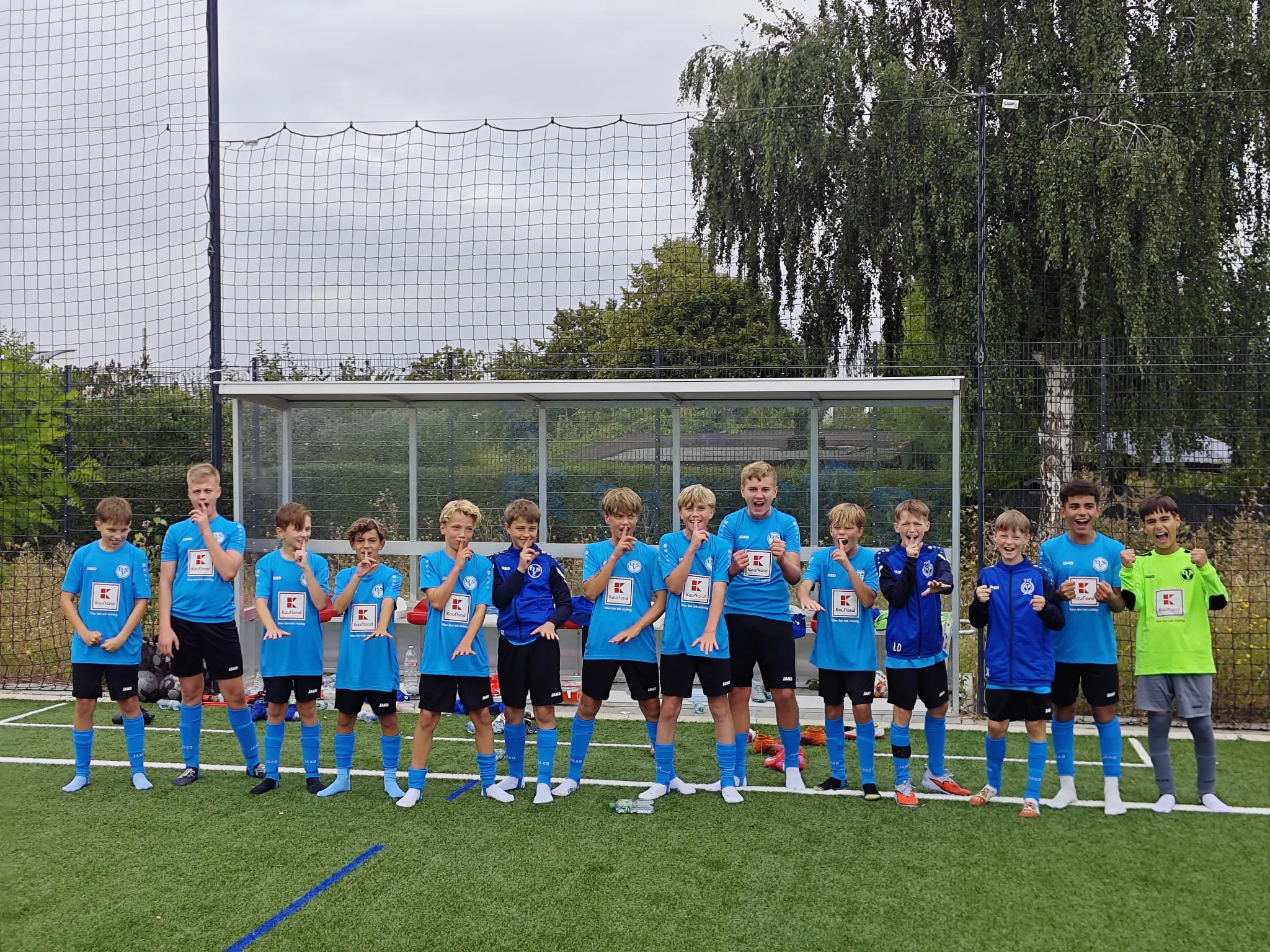 Spieltag 1 Verbandsliga, endlich ging es los, es kribbelte in den Füßen der Kids und in den Köpfen der Trainer, wie hält man mit, wo steht man, was kann man erreichen? Toll war, dass alle 20 Kids sich zur Verfügung stellten und wir vor der kniffligen Aufgabe standen einen Spieltagskader zu bennennen. Es machten sich dann 14 motivierte Kids auf nach Halle, wenngleich Liam nach dem Erwärmen feststellte, der Muskel will noch nicht so richtig, daher verzichtete man auf seinen EInsatz. Wir bauten spontan um und begannen das Spiel forsch und durchaus dominant. Es dauerte nich lang und schon hatte man 2 große Chancen über Yosef, jeweils knapp gescheitert. Wir blieben am Drücker und dann war es soweit, starkes Pressing, Balleroberung, Hannes geht durch und bleibt eiskalt! Danach blieben wir wach und es dauerte nicht lange, da klingelte es erneut. Eine schöner Pass von Hans landet vor Hannes Füßen, der einen Strahl an die Unterkante der Latte schickt und von da ins Tor, 2:0. Wir hielten Halle relativ gut weg vom Tor, einige Standards ließen wir zu, von da ein Konter, Yosef und Hannes laufen gegen einen Gegenspieler aufs Halle Tor zu, Pass von Yosef auf Hannes und 3:0? Leider nein, knappes Abseits. Aber es war noch nicht Halbzeit, der heute sehr emsige Philip wurde noch stark eingesetzt ging durch und scheiterte am HFC Keeper.