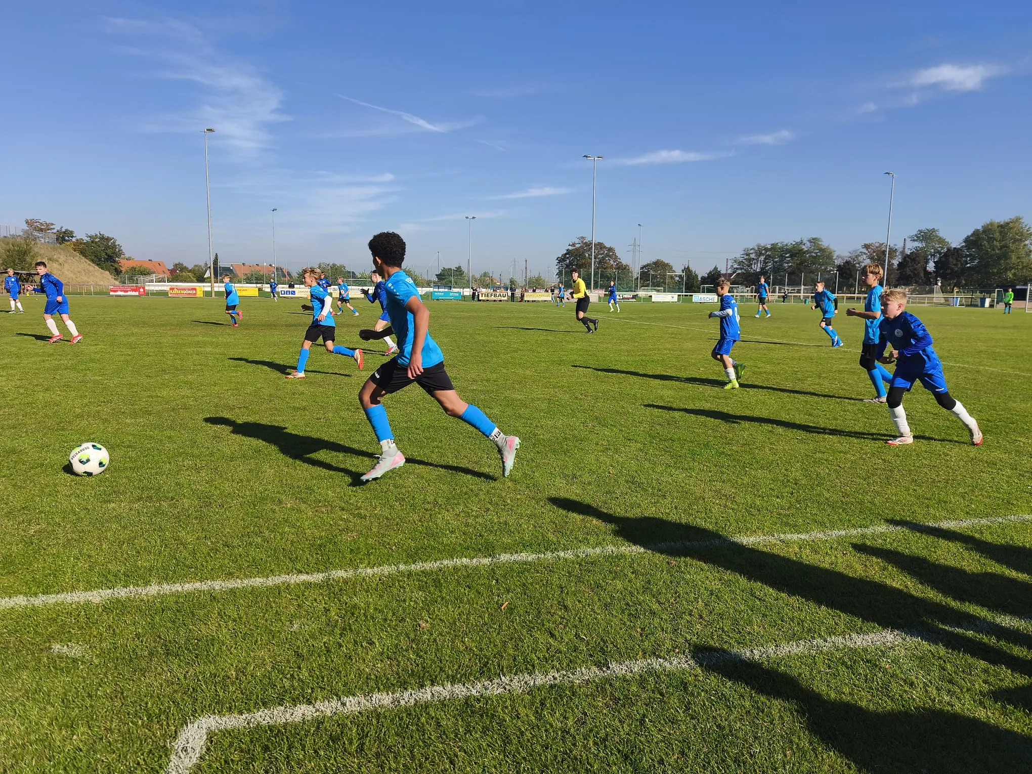 Allerdings blieben wir geduldig und ließen auch hinten nicht viel zu, wenngleich 1/2 Unkonzentriertheiten das Bild etwas trübten, aber man muss sagen, wie unser Mittelfeld immer nach hinten arbeitet, verdient ganz viel Lob. Es lief dann schon die 19. Minute als Hannes einen schon tot geglaubten Ball von der Torlinie dem Fortuna Spieler wegstiebitzte und dann mit links aus relativ schwierigem Winkel traf, toll nachgesetzt! Wir blieben am Drücker und keine 2 Minuten später war es wieder ein toller Angriff über rechts, Philip auf Hannes, der mit der perfekt getimten Hereingabe, Yosef hatte dann aus 6m im Strafraum kein Problem und netzte zum verdienten 0:2. In der Folge verpassten wir dann die Vorentscheidung und das 0:3 (2 Riesenchancen) und holten uns sogar eine gelbe Karte (Liam) ab. Der SR warf allerdings auch mit Karten um sich. Hier wurde teilweise für Nichts Gelb gegeben, während Fortuna für viel härtere Fouls ebenso Gelb sah. Am Ende für ein D Jugend Spiel unübliche 6 gelbe Karten (je 3 pro Seite), da hatte der SR seinen Anteil. 17:3 Torschüsse zur Halbzeit sprechen für die Dominanz, aber auch für unsere Abschlussprobleme, Fortuna mit 2 guten Gelegenheiten, einmal vorbei, einmal Leo im Tor zur Stelle.