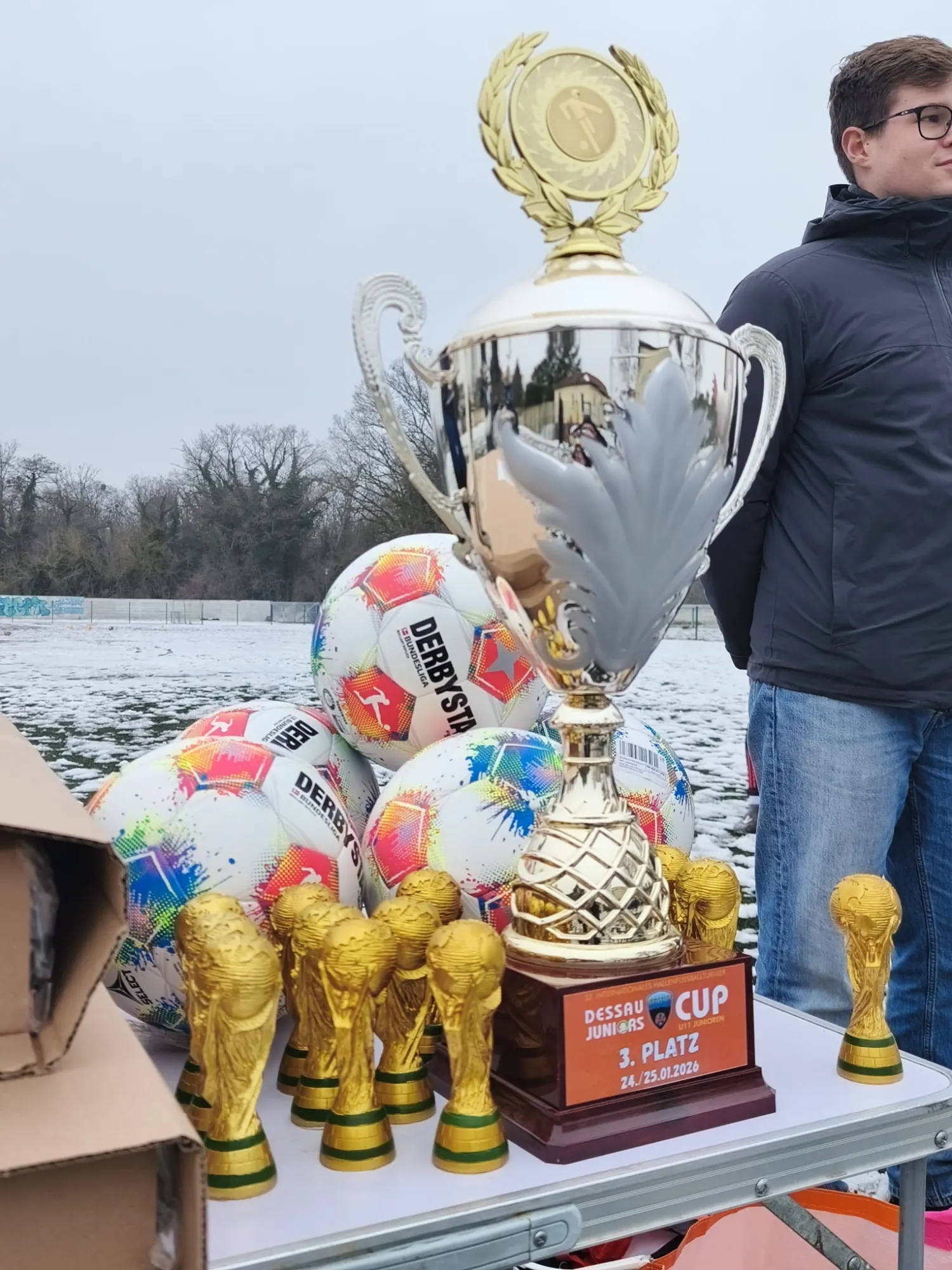 Aufgrund der fantastischen Turnierplatzierung hatte die Mannschaft am gestrigen Montagnachmittag Besuch von Anhalt Sport e.V.. Im Gepäck hatte die Delegation einen großen Pokal für die Mannschaft, fünf neue Fußbälle und einen kleinen Erinnerungspokal für jeden Spieler.