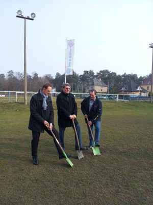 Heute Mittwoch den 05.03.2014 ist es endlich soweit. Mit dem Spatenstich von Gerald Pfeiffer, Bernd Fiebig und Ralph Hirsch wurde das Bauvorhaben begonnen. Die Tiefbauarbeiten sollen bis Ostern abgeschlossen sein, so dass dann der Aufbau des eigentlichen Kunstrasen stattfinden kann. Abhängig von der Wetterlage, bzw. sonstigen Eventualitäten soll das Projekt dann bis Mitte Mai abgeschlossen sein.