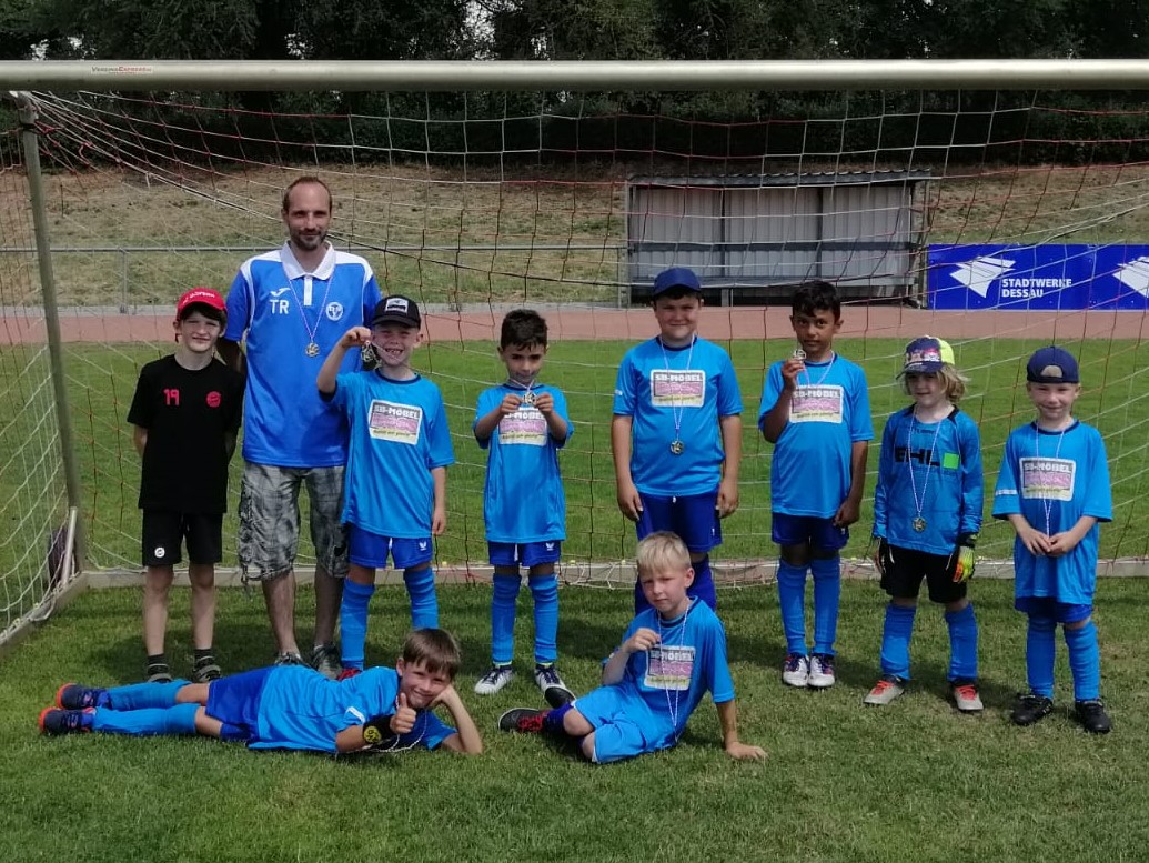 In Aken lief es gut für unser Team (bestehend aus: TW Milo, sowie Matteo, Carlo, Yakup, Georg, Luke, Mustafa, David), im ersten Spiel konnte Reppichau klar und deutlich mit 7:0 besiegt werden. Im 2. Spiel wartete Zerbst, auch hier ein deutliches 4:1. Im 3. Spiel dann ein hochklassiges Match gegen den CFC aus Köthen, das man knapp mit 2:1 verlor - die Riesenchance zum Ausgleich ließ man leider liegen. Als Gruppenzweiter traf man dann im Halbfinale auf die Jungs von Blau Weiß Dessau, die ihre Gruppe klar gewannen. Dieses Spiel war vor allem defensiv super stark von unseren Jungs und was aufs Tor kam hielt TW Milo sehr sicher. Ein abgefälschter Freistoß von Carlo brachte uns schließlich den 1:0 Sieg. Da es gegen BW immer eng ist, war das für uns ein sehr großer Erfolg!